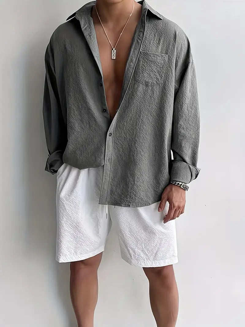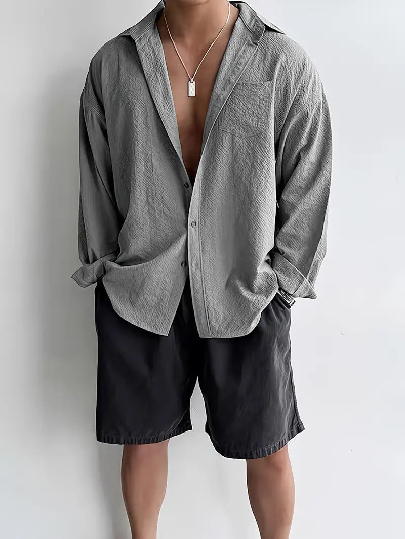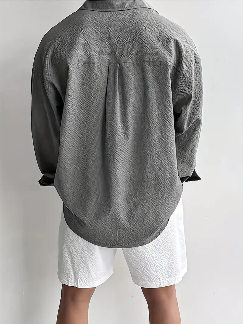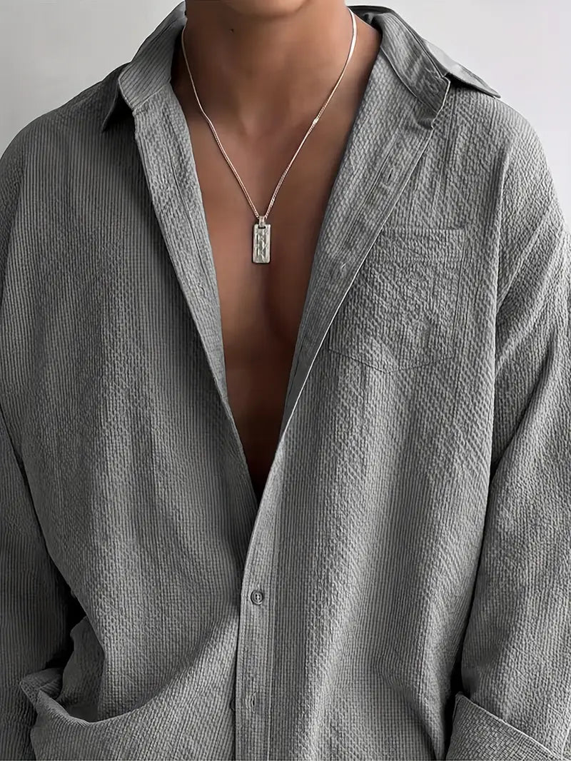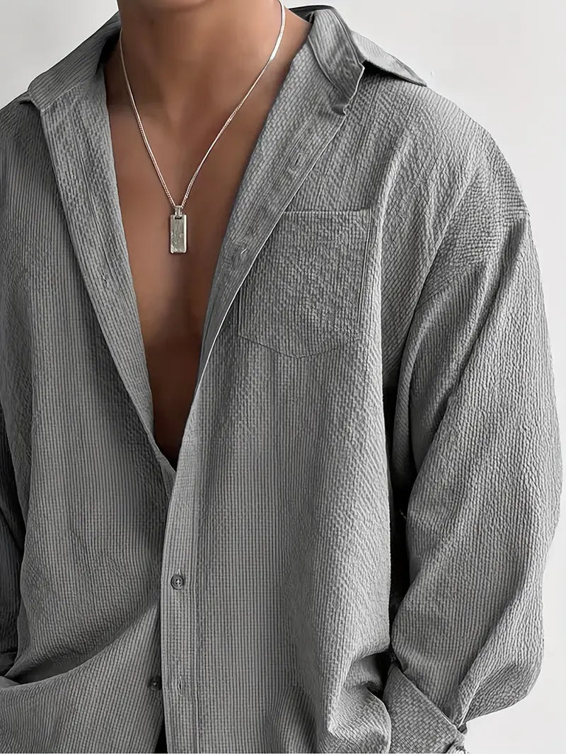 This men's long sleeve shirt features a loose fit design crafted from premium textured polyester for all-season comfort. It includes a classic lapel collar and a functional pocket, showcasing a subtle geometric pattern. Designed with breathable, non-stretch woven fabric, it offers a relaxed, casual style suitable for everyday wear. Available in plus sizes, this high-quality shirt combines comfort and style with easy care instructions—hand wash only, no dry cleaning. Ideal for men seeking a durable and versatile wardrobe essential with a timeless look.