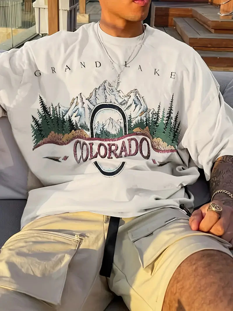 Men's Grand Lake Colorado Graphic T-Shirt features a distinctive mountain and forest design on premium knitted polyester fabric. This regular-fit crew neck tee combines slight stretch with lightweight comfort, ideal for summer activities. The positioning-printed alphabetic pattern adds visual interest while maintaining a casual aesthetic. Suitable for adult wear, this breathable short-sleeve shirt transitions effortlessly from outdoor adventures to leisure pursuits. Requires simple hand washing or professional dry cleaning to maintain quality.