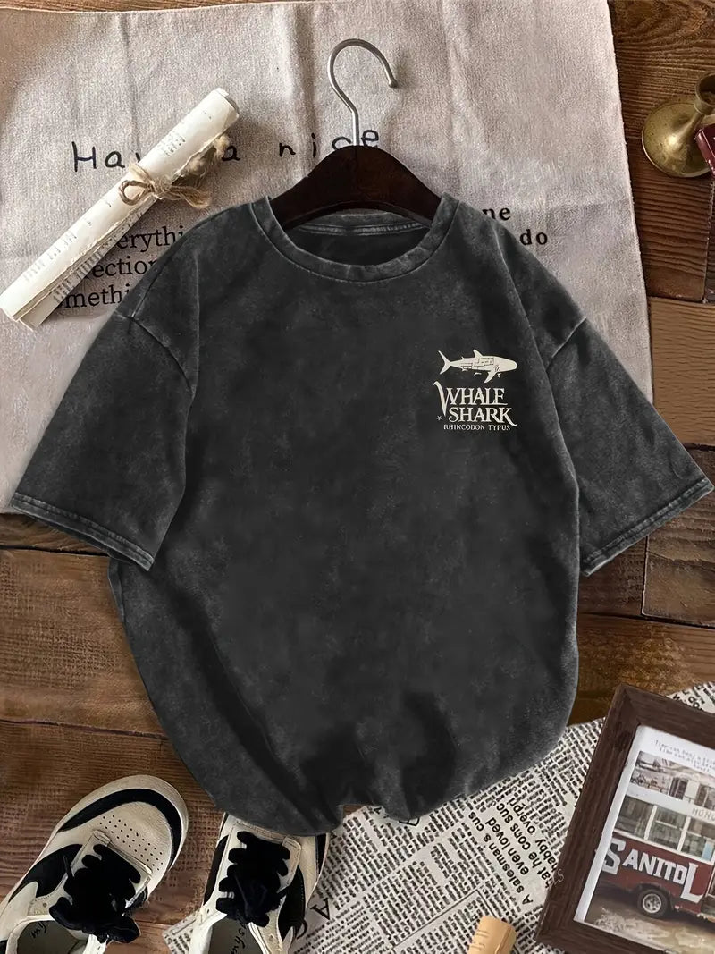 This Vintage Whale Shark T-shirt features a casual crew neck and short sleeves, crafted from durable cotton with mid-level stretch for comfort. The washed black fabric highlights an educational marine life graphic, printed using precise positioning techniques for a retro-inspired look. Designed for summer wear, it offers a regular fit and easy care with machine wash instructions, making it an ideal choice for warm-weather outings.
